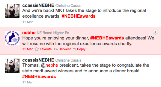 Are you not quite sure what a "live feed" of the events means? Check out the photo of the #NEBHEawards Twitter time line below:
