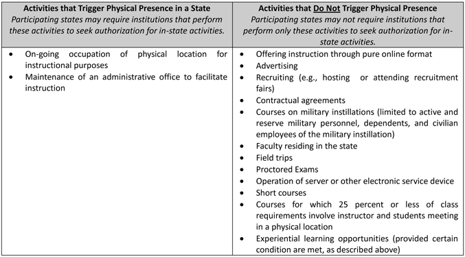 B. Institutional activities in a state that meet the definition of physical presence , as defined here, permit but do not require a state to require the institution to seek authorization by that state, both for the general authority to offer instruction within that state.