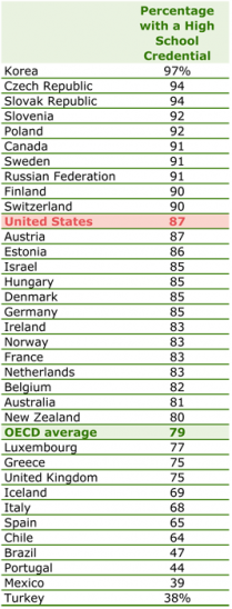 - Several foreign countries outperform the U.S. in the percentage of 25- to 34-year-olds with a high school credential.